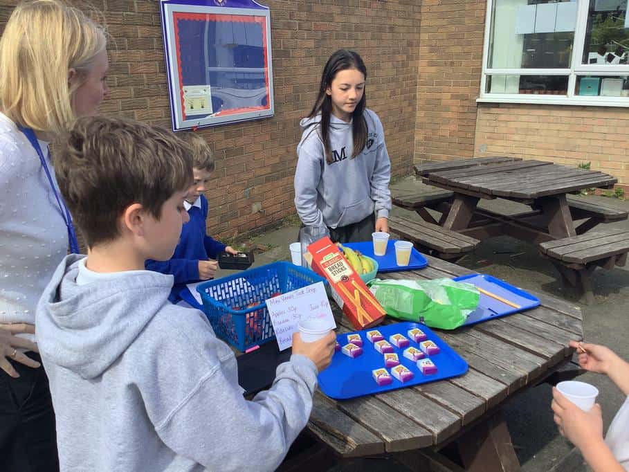 The mini vinnies planned a healthy tuck shop to raise money for Hebburn Helps. During a Mini Vinnie meeting the children asked to run the tuck shop to raise money for the most vunerable people in our society. They planned which food would be sold and made signs to advertise their shop. We raised lots of money for Hebburn Helps.